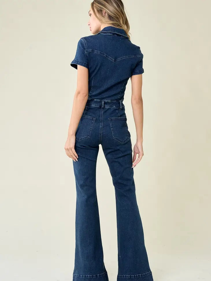 Premium flare/bootcut leg full length denim jumpsuit with functional buttons and stretchy denim fabric