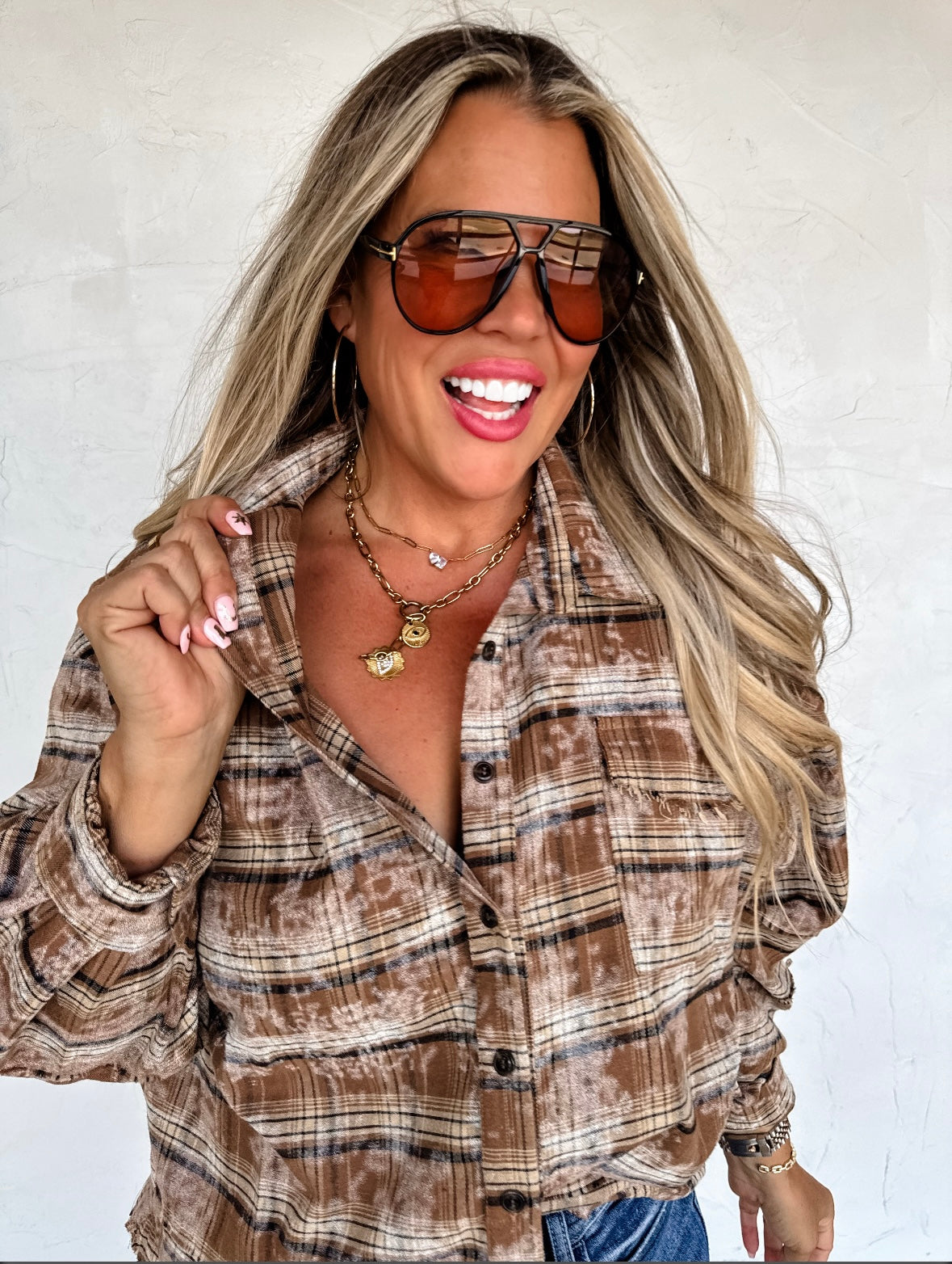 Cozy meets casual in these must-have plaid button-down tops, perfect for layering season. In gorgeous Fall colors, these shacket-style tops feature a bleached, raw hem details, bleached fabric, relaxed fit, and front chest pockets for a laid-back, versatile look. Wear them open over a tee or buttoned up for warmth and style—your go-to for chilly days and cozy vibes!